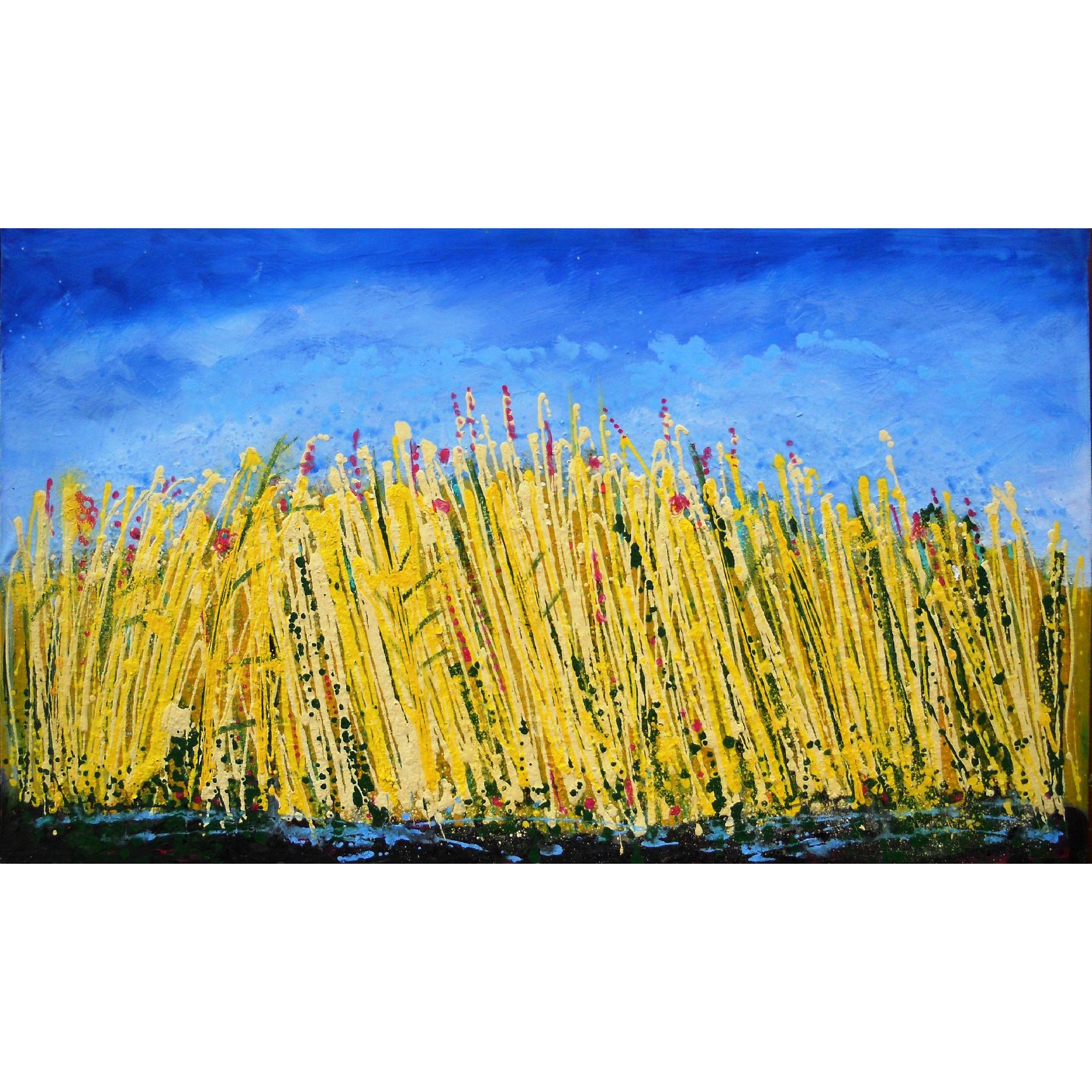L'opera è realizzata su tela dipinta ad acrilico. Un vortice di colori e sensazioni, il colore pulsa e vive sulla tela, molto materica, rappresenta un campo giallo di grano pronto per la mietitura. Ci sono fiori e papaveri, mentre nella parte bassa si intravede l'acqua di una canale. Potrebbe essere un argine fiorito. Nel cielo ci sono nuvole e movimento. Amo i cieli di Constable.