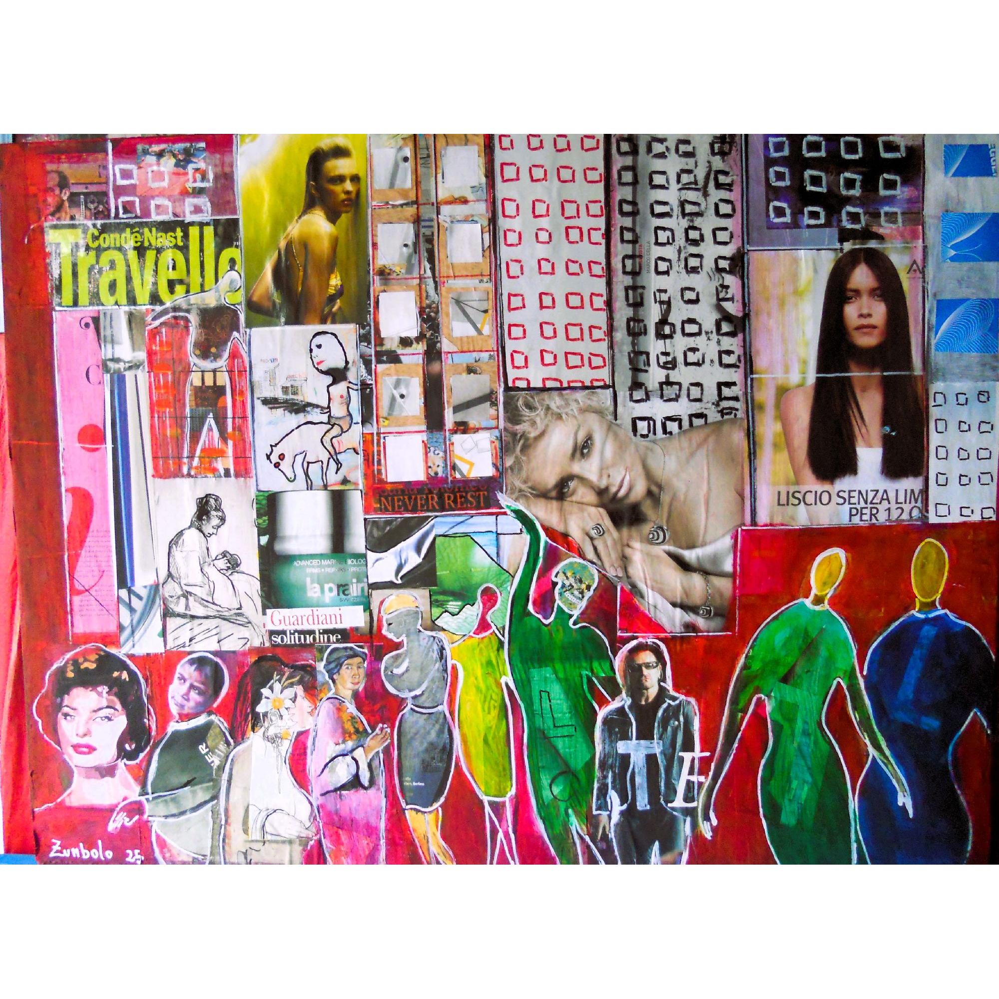 In questa opera ho voluto catturare l'energia caotica e vibrante della società moderna, mescolando immagini di realtà e fantasia con colori acrilici vividi e dettagli in china. Il collage rappresenta la frammentazione delle identità, mentre le figure stilizzate dialogano con il realismo pop. Voglio che chi la osserva senta un coinvolgimento emotivo, come se entrasse in un mondo dove la vita pulsa davanti ai suoi occhi.